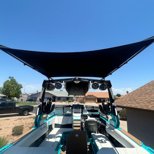Wakesurf Shade Bimini Extension for all 2019 - 2025 Nautique Boats equipped with the standard tower (Non-telescopic tower). This kit mounts directly to your wakeboard tower and can be deployed while surfing up to 15mph.